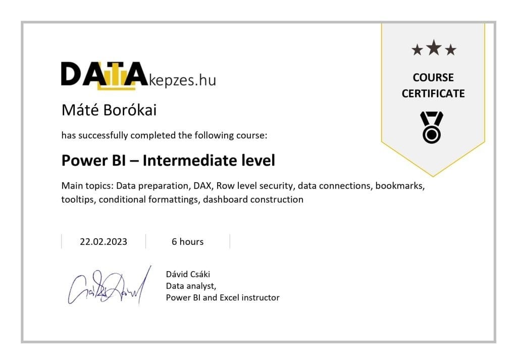 Máté Borókai – completion certificate for Power BI Intermediate level Read More »