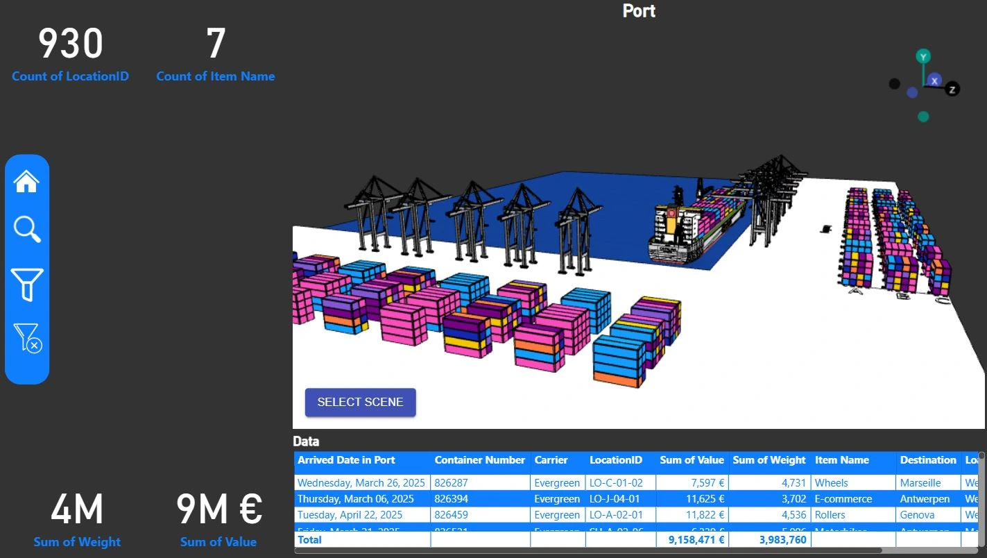 3D kikötő dashboard, néhány kattintással elemezhetők a kikötőben található konténerek értékei, rakodási dátumai vagy szállítási helyei.