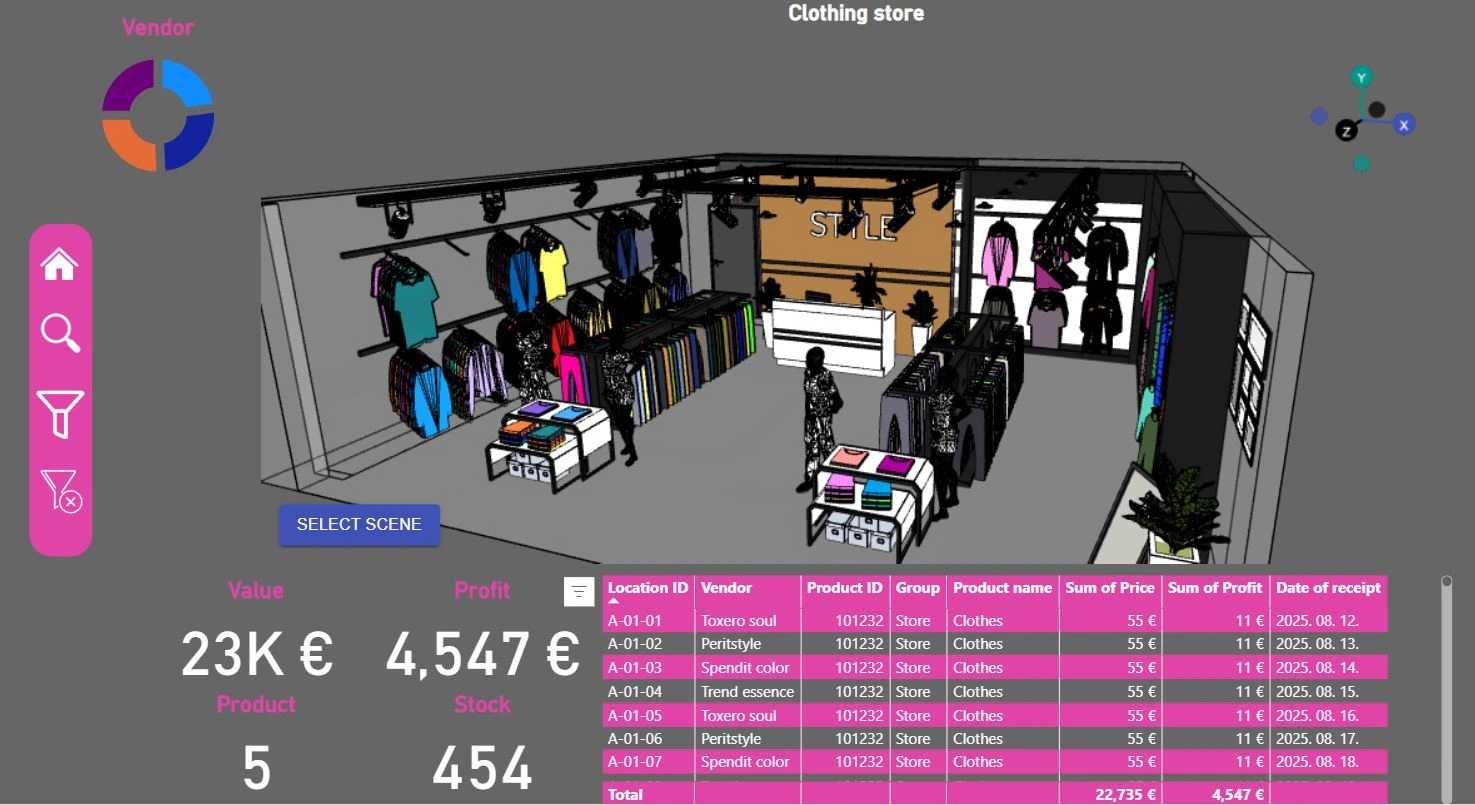 3D interaktív ruhabolt riport. Néhány kattintással elemezhetők a bolti készletek, valamint alkalmas az üzletben található ruhák (üzlet, raktár) lokalizálására.