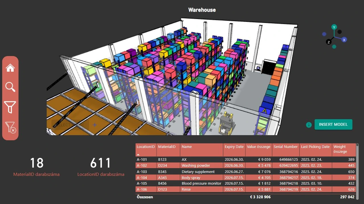 Döntéstámogató 3D raktári dashboard, amely alkalmas ABC analízisre, tárhelyelemzésre és raktárkapacitás mérésére.