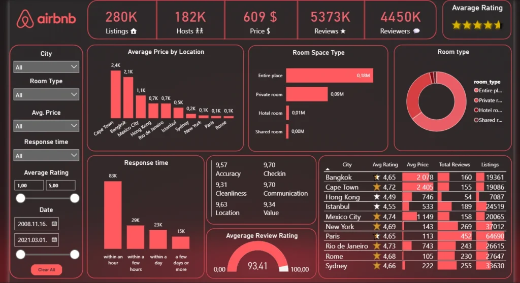 Interaktív riport, amely áttekintést ad a városok, árak, értékelések és foglalási minták összefüggéseiről.